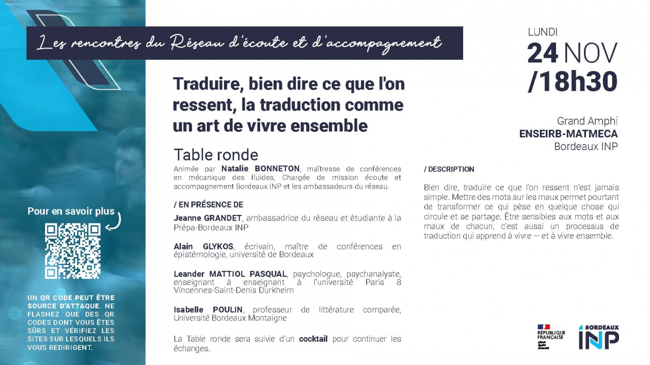 Les membres et les ambassadeurs du réseau d'écoute et d'accompagnement ont le plaisir de vous inviter à la prochaine Rencontre du réseau. Elle aura lieu le 24 novembre, à 18h30, dans le grand amphi de l'ENSEIRB-MATMECA.